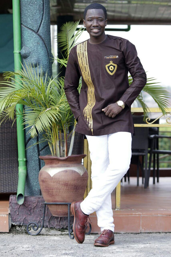 Brown & Golden Strips Embroidered Long Sleeve shirt made from high quality cotton material. This is a Classic Men's African Fashion Wear perfectly sewn and it is ideal for all your special occasions be it wedding, church service, party, dinner as well as your casual outings.