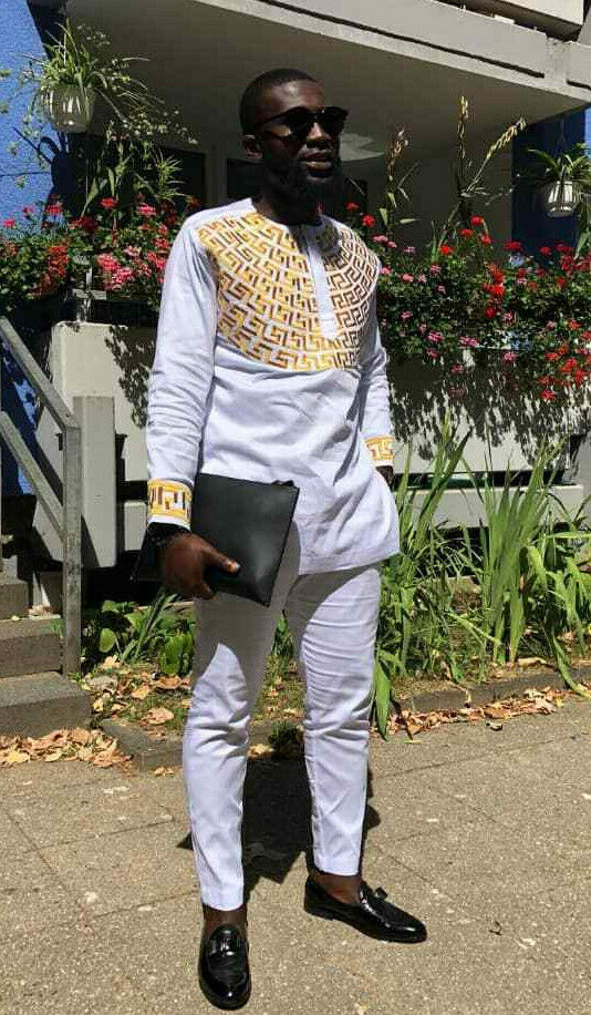 Classic Men's White Long Sleeve Shirt and Pants African clothing finely and neatly sewn. It has unique and exquisite embroidery pattern and it's made with high quality fabric. The finishing is just on point and it is perfect for any special occasion be it Wedding, Church service, African Heritage Party, Black History Month celebrations,festivals as well as other formal occasions.