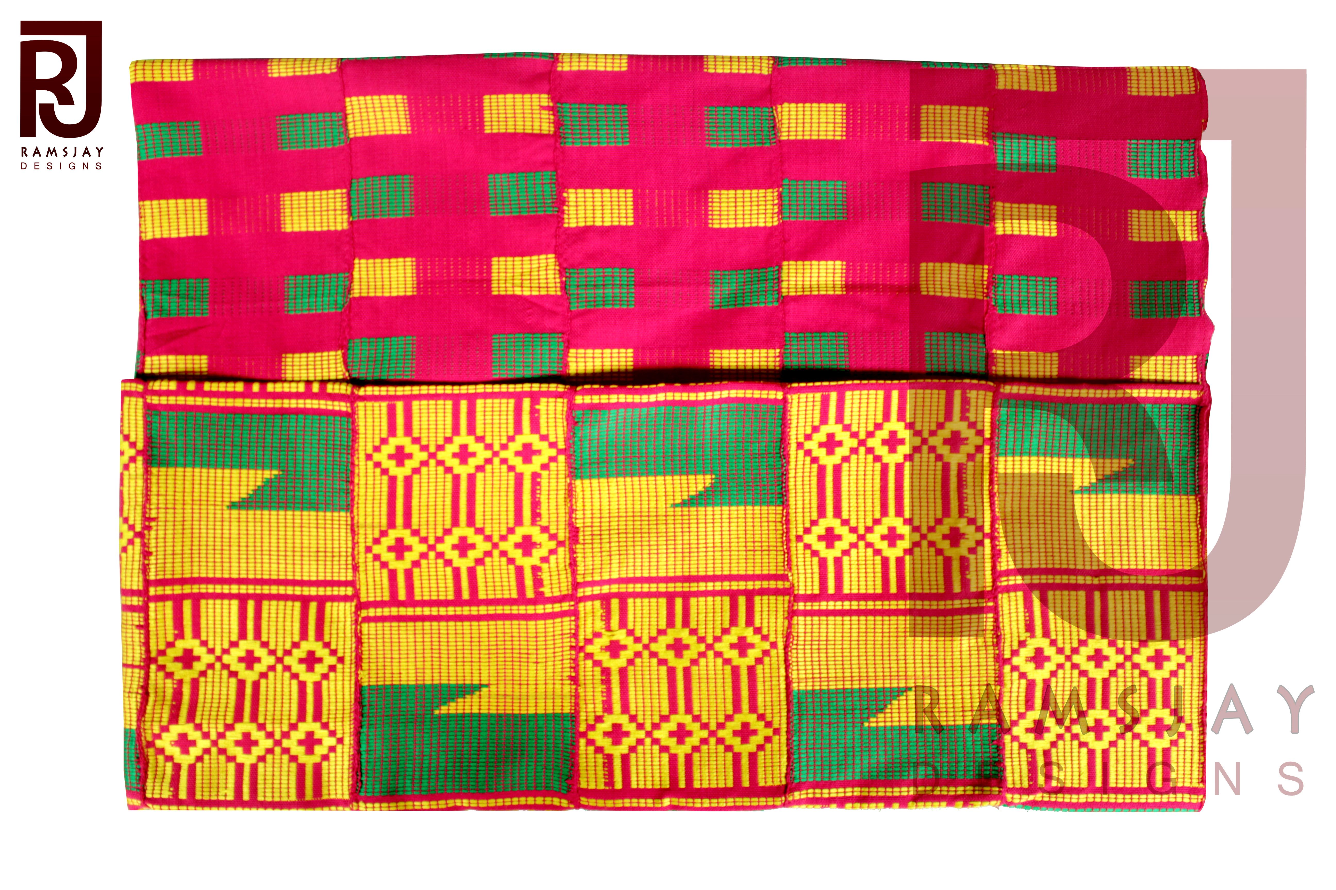 This is a beautiful traditional handwoven Kente cloth from Bonwire,Ghana. It is full of vibrant colors, 100% cotton,to suit every style! Kente cloth which is a type of silk and cotton fabric made of interwoven cloth strips is the royal and sacred cloth of the Ashantis in the Republic of Ghana. It is a unisex adult cloth and worn in times of extreme importance. The men's cloth is larger than that of the women. This prestigious cloth is worn during important functions like Engagements, Weddings, Graduations and any other important event.