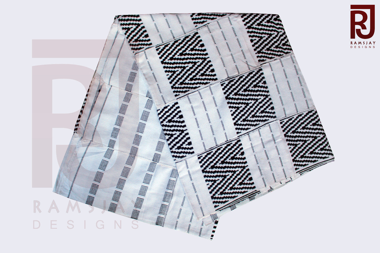 An elegant traditional white and black handwoven Kente cloth from Bonwire, Ghana. Kente cloth which is a type of silk and cotton fabric made of interwoven cloth strips is the royal and sacred cloth of the Ashantis in the Republic of Ghana. It is a unisex adult cloth and worn in times of extreme importance. The men's cloth is larger than that of the women. This prestigious cloth is worn during important functions like Engagements, Weddings, Church service, Graduations and any other important event.