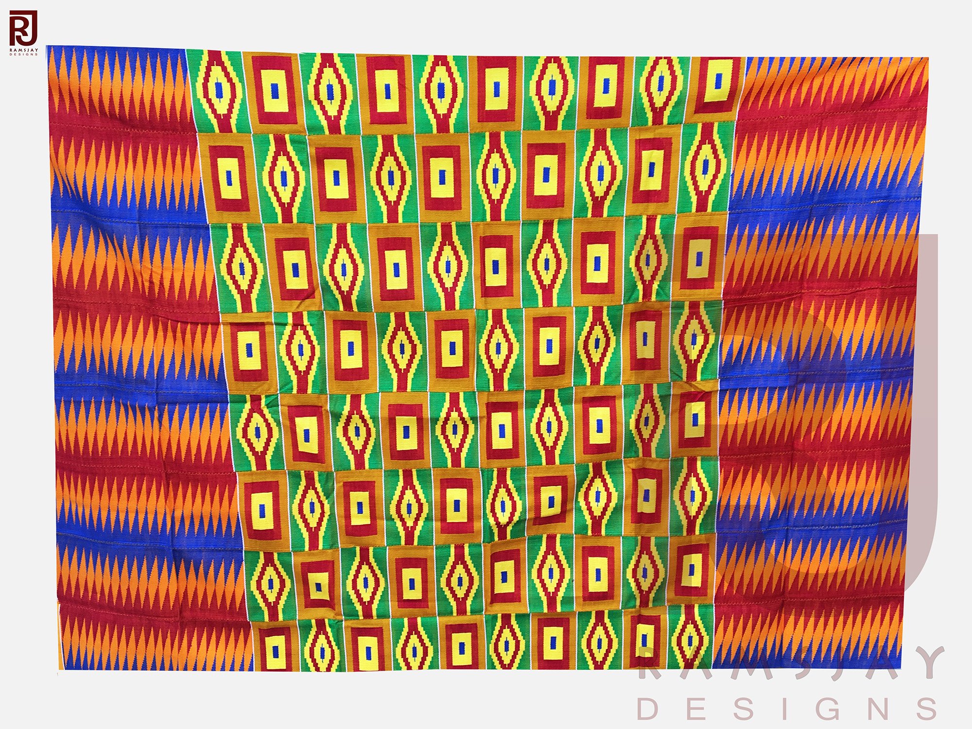 This is a beautiful traditional handwoven Kente cloth from Bonwire, Ghana. It is colorful and has a very beautifully designed pattern. Kente cloth which is a type of silk and cotton fabric made of interwoven cloth strips is the royal and sacred cloth of the Ashantis in the Republic of Ghana. It is a unisex adult cloth and worn in times of extreme importance. The men's cloth is larger than that of the women. This prestigious cloth is worn during important functions like Engagements, Weddings, Graduations and any other important event.