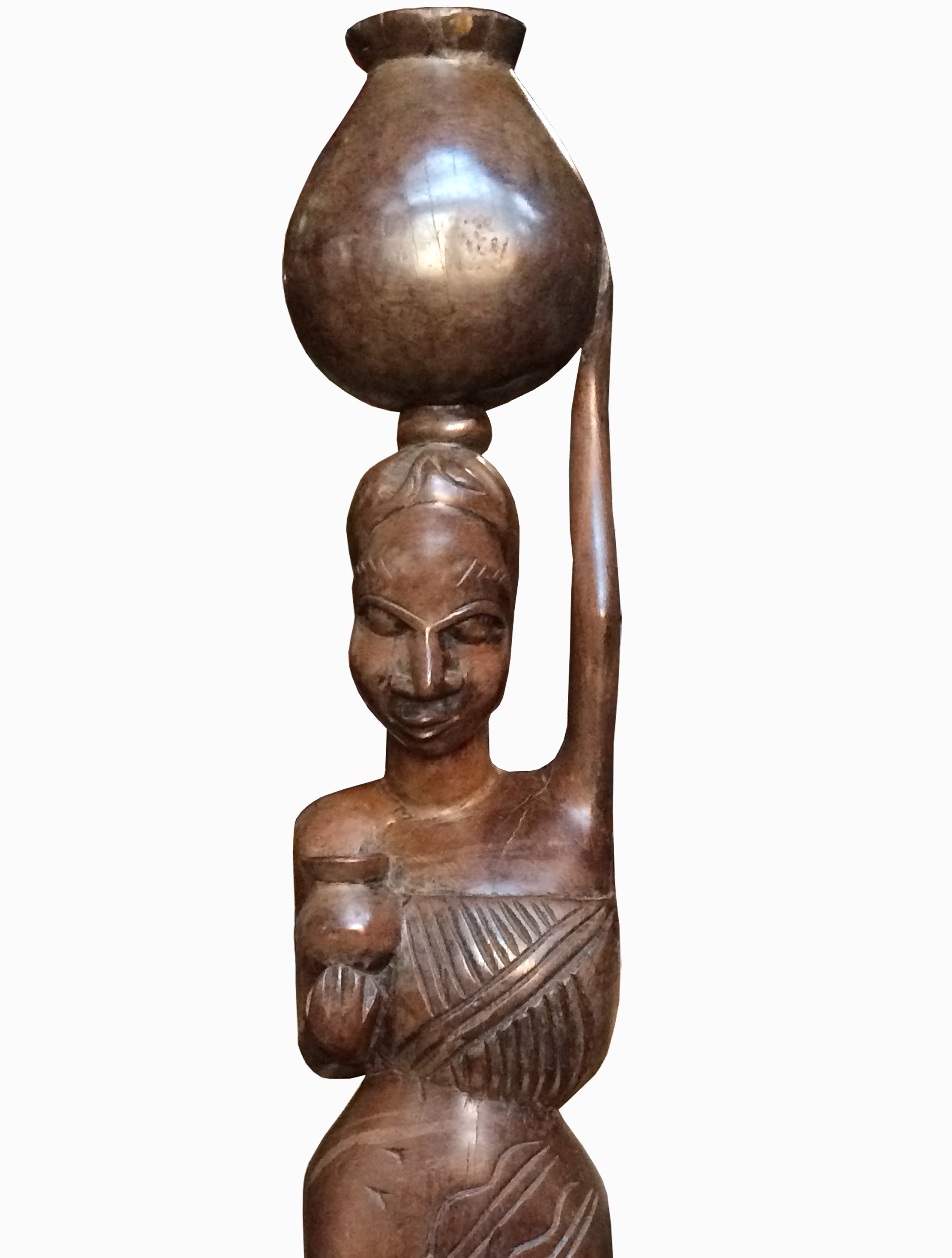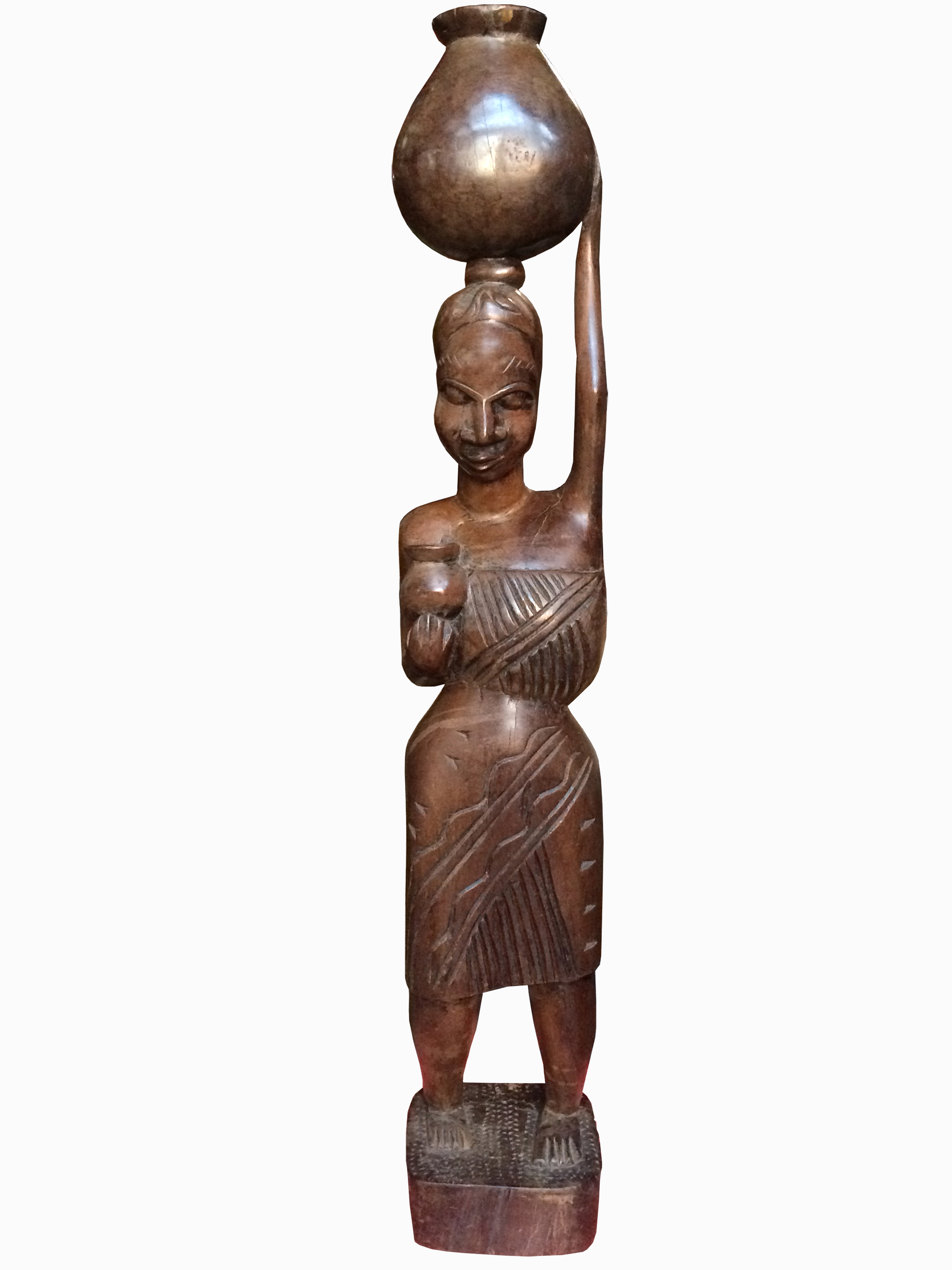 A sculpted African mother bears a heavy pot of water on her head, hiring out her strength as a carrier to support her family. This is a symbol of the industrious nature of most African women. A wax finish further highlights the figure’s beauty. This graceful figure was crafted from naturally dried ebony wood, exquisitely carved by hand.