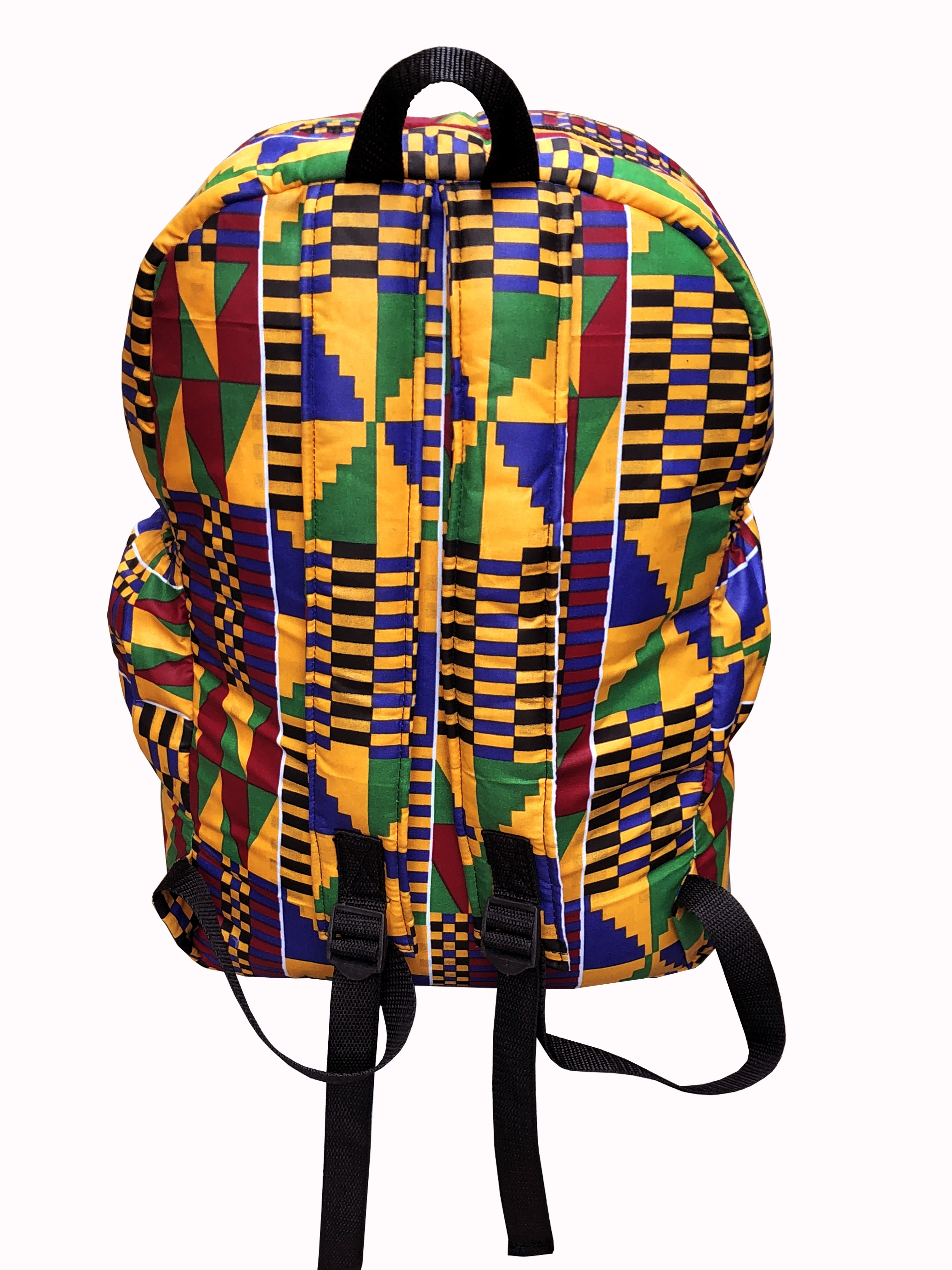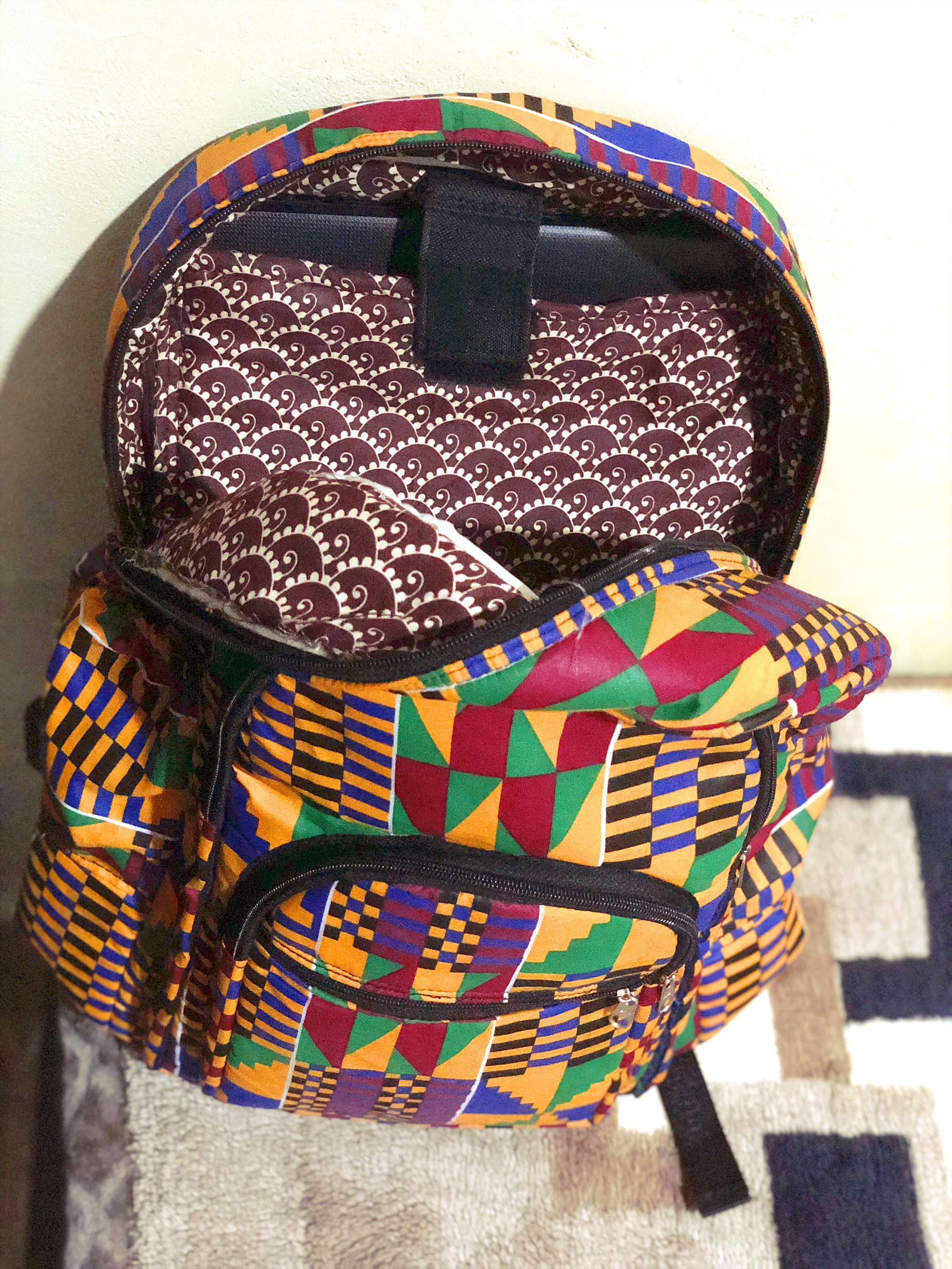 This is a beautiful quality handmade backpack made from quilted African kente fabrics. It is cute and has enough space for your books, handouts, laptop, tablets and other stuff. It is also a perfect bag for walkers and climbers.