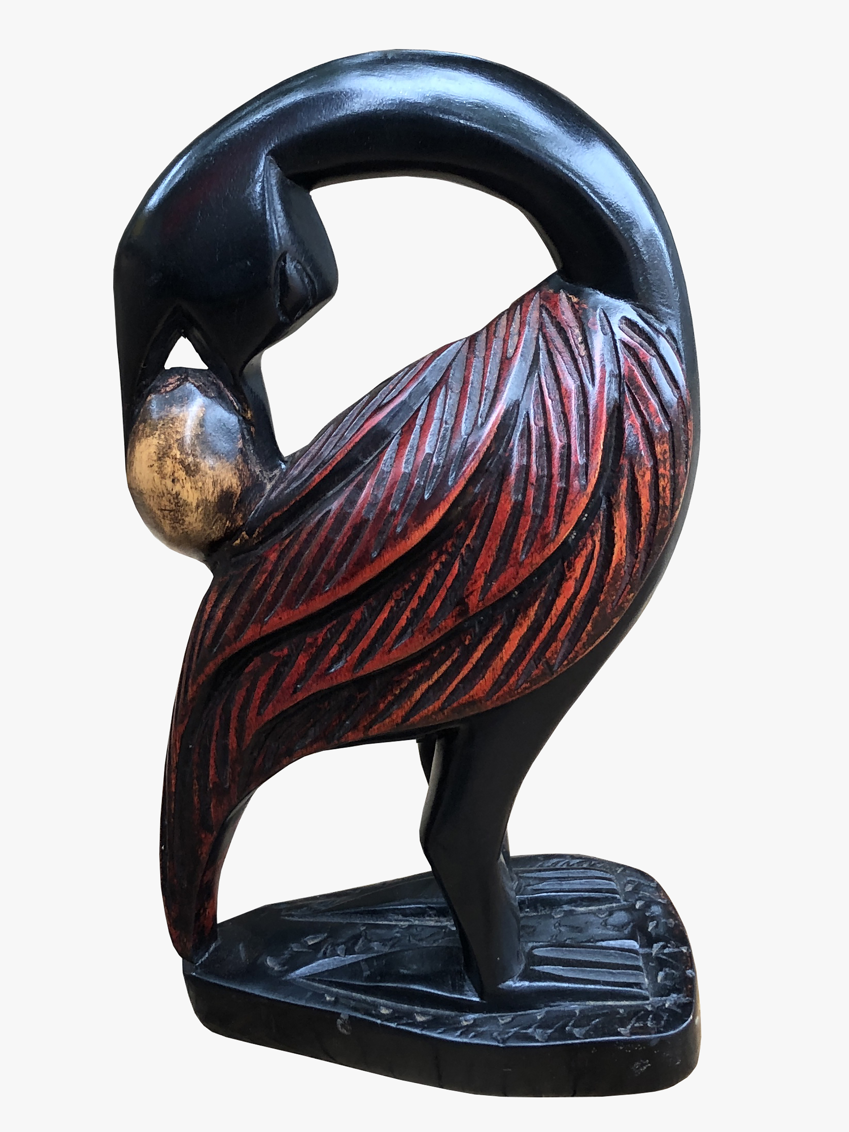 This is a hand carved Sankofa bird from Ghana, West Africa. The concept of Sankofa was derived from King Adinkera of the Akan people of West Africa. Sankofa is a word in the Twi language of Ghana that translates as "Go back and get it". Visually and symbolically, Sankofa is represented by a mythic bird with its head turned backwards taking an egg off its back.