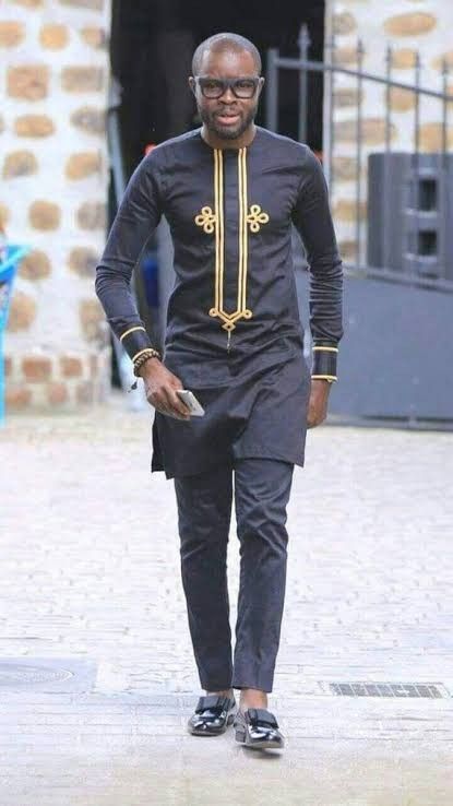 This black and gold Men’s African shirt and pants is finely and neatly made. It has a beautiful gold embroidery design and it’s made with high quality fabric. It has a perfect finish and it is perfect for any special occasion be it wedding, church, party, outdooring, etc.